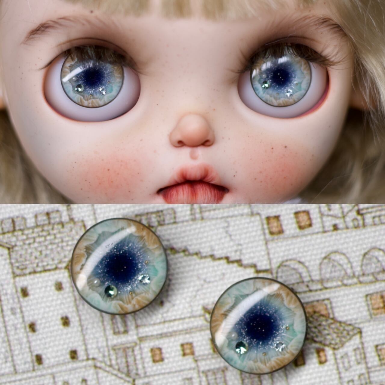 【受注製作】【ブライス用アイチップ】ドールアイ Blythe カスタムアイ ネオブライス ストーン入り 磁石タイプ変更可能 手彫り眼紋 キラキラ瞳 UVレジン 手作り オリジナル ハンドメイド SLOWCORE 繁星