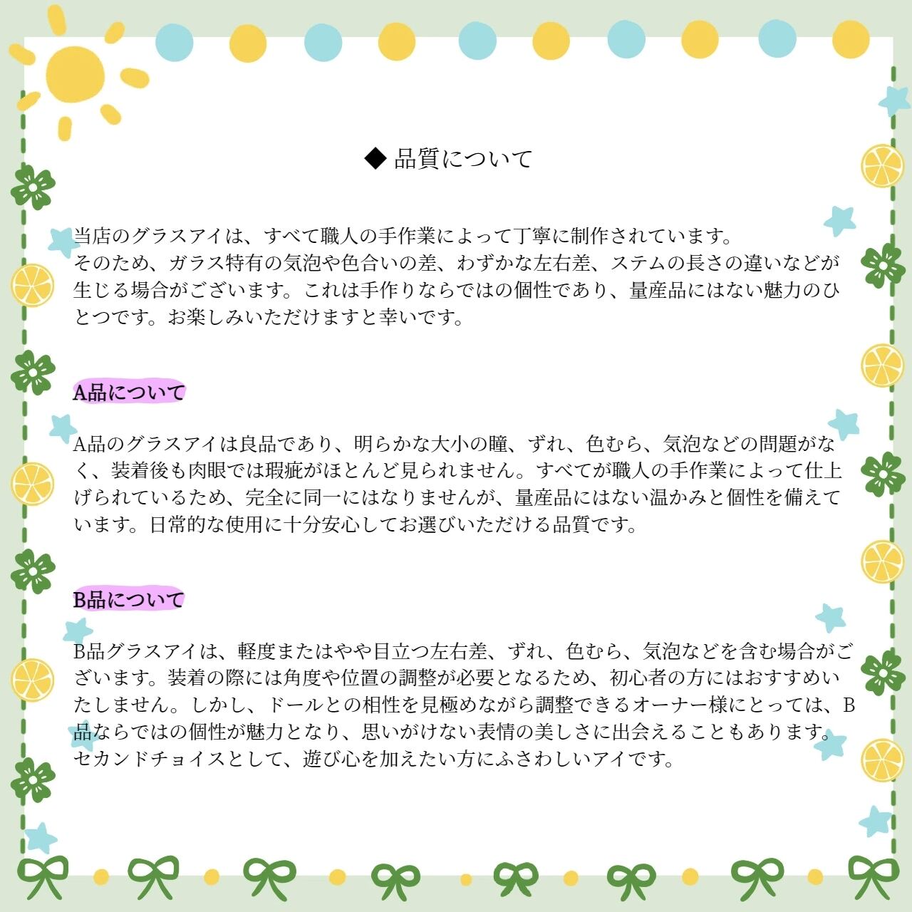 当店で取り扱うグラスアイは、すべて職人の手作業によって一粒ずつ丁寧に焼き上げられた作品です。そのため、製造工程の特性上、微細な気泡、色味のわずかな違い、光の加減による印象差、ステムの長さや瞳の位置の個体差などが見られることがございます。量産品にはない、手作りならではの風合いや個性としてご理解いただけますと幸いです。発送前には、できる限りペアのバランスを確認し、最適なお品をお届けできるよう努めております。